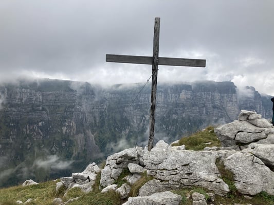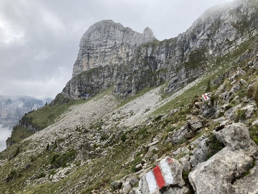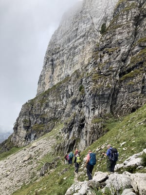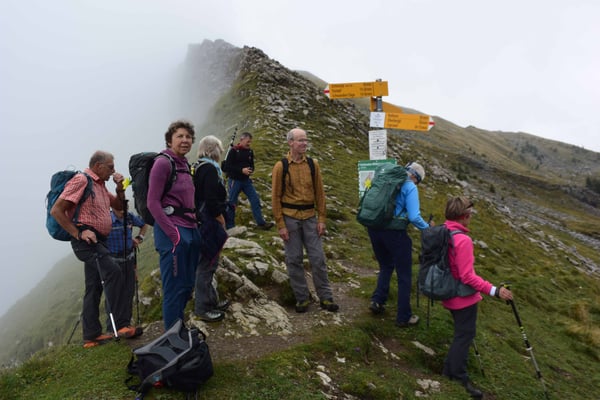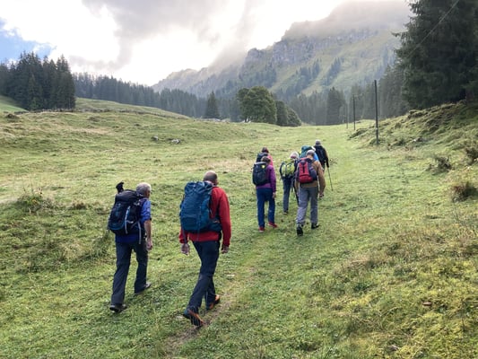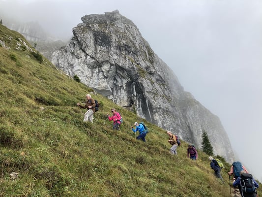 8 optimistische Bergkameradinnen und Kameraden begleiteten mich nach Schwanden Säge. Das Wetter liess uns hoffen. Der Aufstieg, erst gemächlich, dann immer steiler und immer die zu