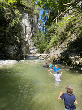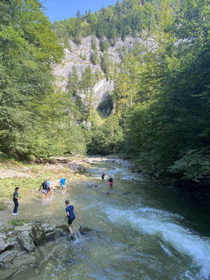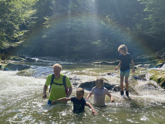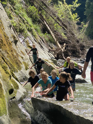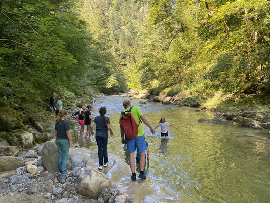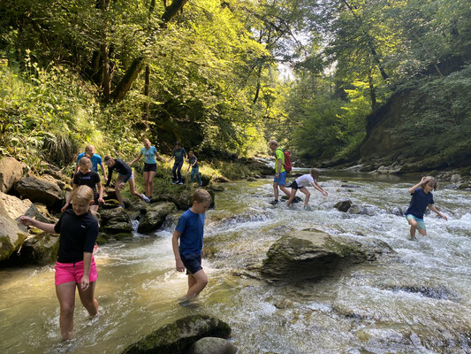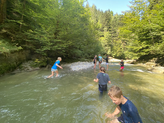 Zu Beginn noch zaghaft begannen wir unsere Bachwanderung beim Haseleggstäg und früher oder später waren wir alle von Kopf bis Fuss nass.