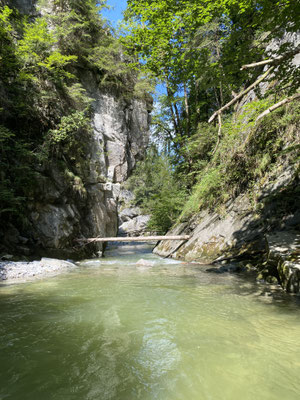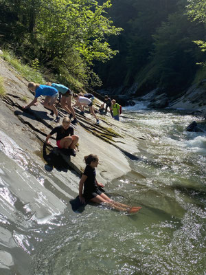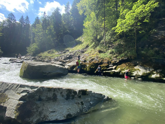 Obschon wir uns hin wieder an der Sonne wärmen konnten, spürten wir das schätzungsweise rund 18 Grad kalte Wasser doch mit der Zeit und wir entschieden nach rund 1,5 Stunden uns auf den Rückweg zu machen. Der Rückweg war aufgrund der Strömung teilweise nicht ganz einfach aber miteinander meisterten wir alle kritischen Stellen. Schon bald waren wieder am Ausgangspunkt wo die trockenen Kleider und Schuhe auf uns warteten. Stolz auf die eigene Leistung wird diese wohl unvergessliche Bachtour noch lange im Gedächtnis bleiben.