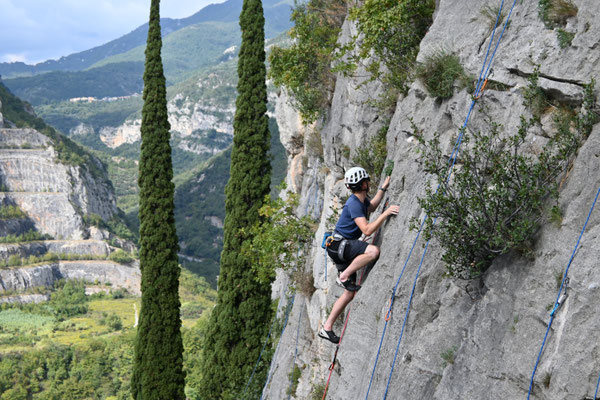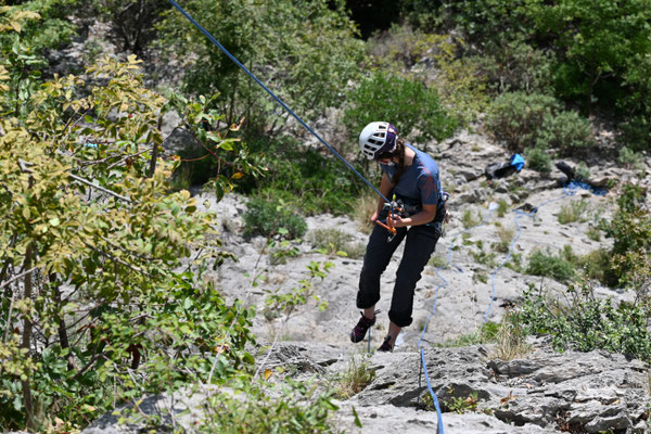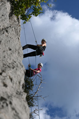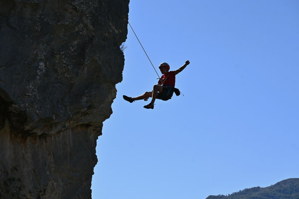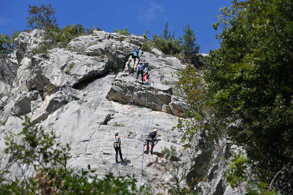 Erwacht sind wir am Morgen schnell, denn nebst dem Schütteln am Zelt wurde es langsam hell. Das Zmorge genossen und den Abwasch vollbracht, wurde alles für die Abfahrt bereit gemacht. Nach einer kurzen Fahrt und einem Fussmarsch von wenigen Minuten, erreichten wir den Klettergarten mit den vielen Routen. Los ging die erste Kletterei, da war auch gleich das Sturztraining mit dabei. Es ging ans Klettern und Ausprobieren, wobei die Idee aufkam einen eigenen Song zu komponieren. Schnell wurde damit losgelegt und bei der Hörprobe waren alle aufgeregt. Der Titel Alpiniste passte wunderbar und dass dies der nächste Hit würde, war uns klar. Nach vielen weiteren Kletterstunden gingen wir den Nachmittag mit einem Einkauf und Baden abrunden. Ob Profikoch im Team oder nicht, entstand in jeder Gruppe zum Znacht ein leckeres Gericht. Der gemeinsame Abwasch war schnell vollbracht, und es haben sich alle nach einigen Spielrunden ins Bett gemacht.