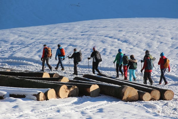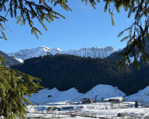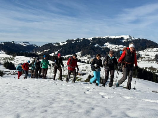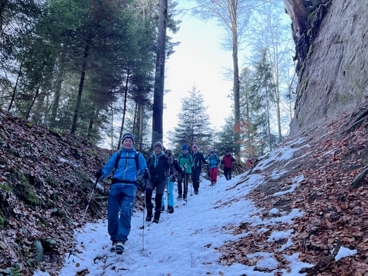 Bei wunderschönem Winterwetter starteten wir neun SACler und zwei Gäste, im Burheim nach Kaffee und Gipfeli unser Verschiebungstour rund ums Burheim. Die befürchteten Erwartungen, dass wir auf unserer Dezembertour viel im Schatten wandern müssen, trafen nur sehr wenig zu, die Sonne meinte es ausserordentlich gut mit uns. Manchmal über Schnee, dann wieder auf Gras stiegen wir hoch zum Langebödeli, dann über die Sandblatte, das ist ein alter Postweg, hinab zum Brandhof und weiter auf den Aussichtspunkt Tellenbach. Wärmend an der Sonne machten wir dort einen längeren Halt, dann querten wir über den idyllischen Lehnwald, liefen vorbei am Bahusweidli und weiter zum Eschengraben. Dort schloss sich nach cirka 4 Stunden der Kreis, das Burheim war umrundet! Wieder im Ausgangspunkt schlossen wir die gemütliche Tour bei einem Entlebucher «Schwarze» zusammen mit Pillys Lebkuchen ab.